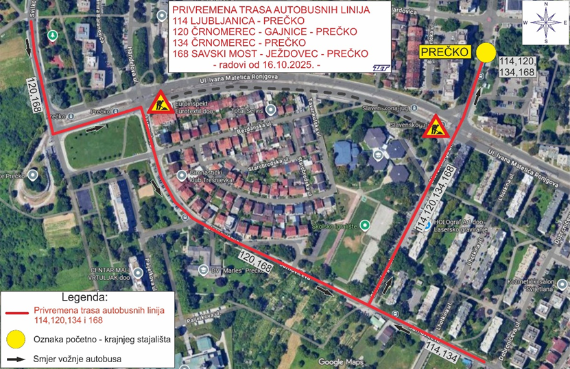 Zbog uređenja kolnika Ulice Ivana Matetića Ronjgova, na relaciji od Jarnovićeve do Ulice Slavenskog, od četvrtka, 16. listopada od 9 sati, do završetka radova, autobusne linije 114, 120, 134 i 168 prometovat će izmijenjenom trasom u smjeru terminala Prečko kako slijedi: