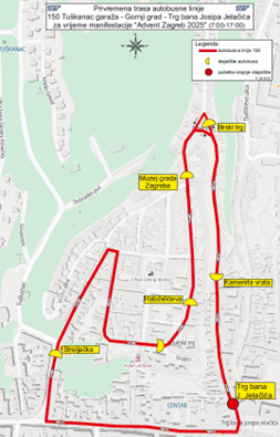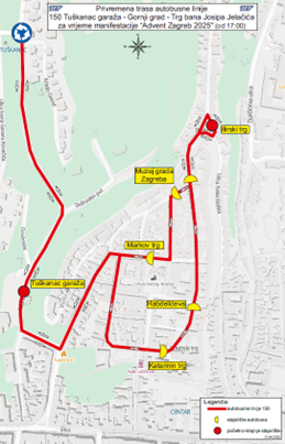 Zbog održavanja manifestacije „Advent Zagreb 2025“, od srijede, 26. studenoga do petka, 9. siječnja, autobusna linija 150 (Tuškanac garaža - Gornji grad - Trg bana Josipa Jelačića) prometovat će izmijenjenom trasom: