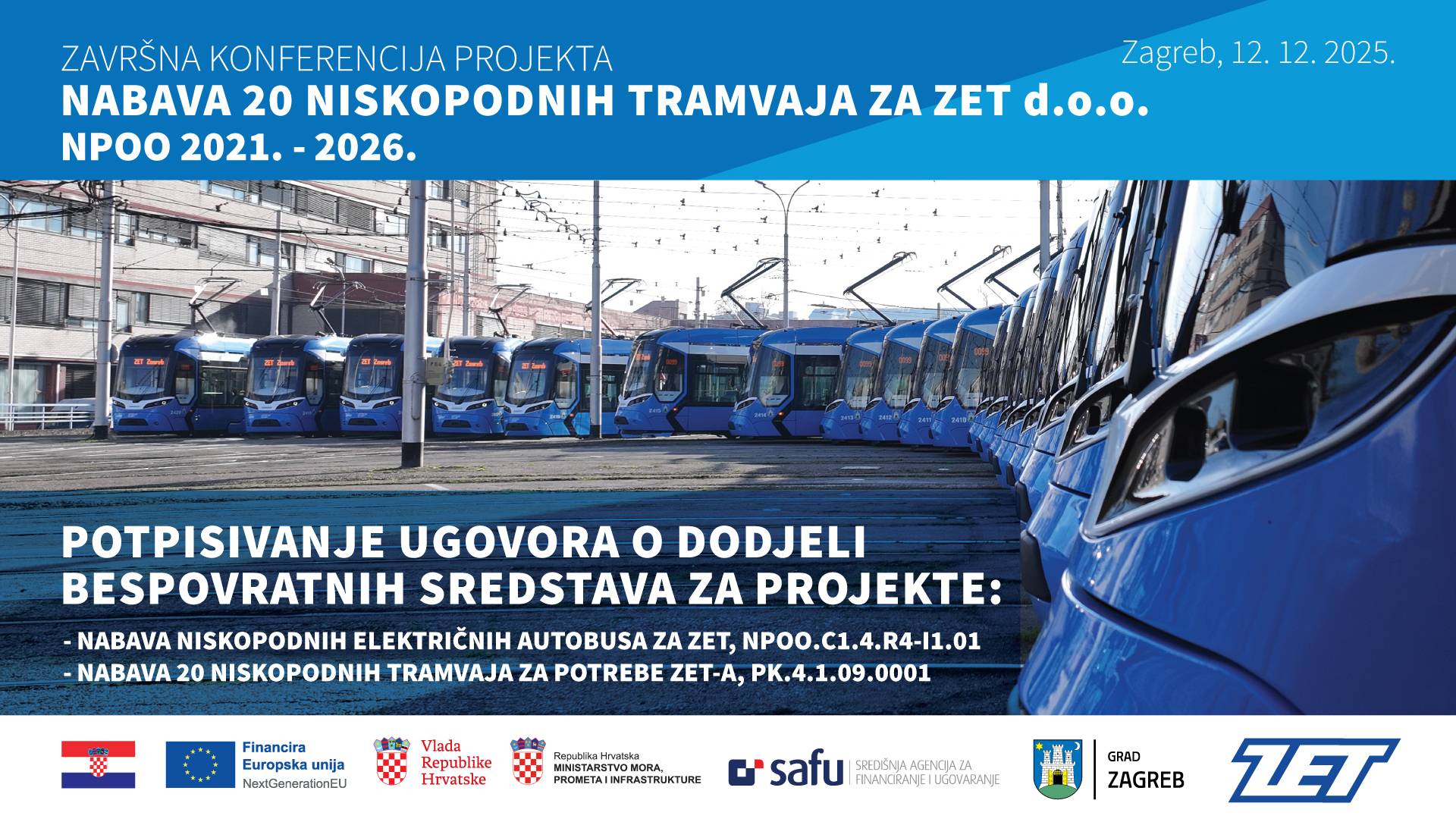 Usto, potpisan je i ugovor o dodjeli bespovratnih sredstava za nabavu 62 niskopodna električna autobusa za ZET, ukupne vrijednosti 56.752.679,83 eura, pri čemu je 45.398.360,00 eura sufinancirano putem NPOO-a. Svi autobusi bit će isporučeni do listopada 2026. Ugovore su potpisali Marko Bogdanović, predsjednik Uprave ZET-a, Dragan Jelić, ravnatelj SAFU-a i Oleg Butković, potpredsjednik Vlade i ministar mora, prometa i infrastrukture.